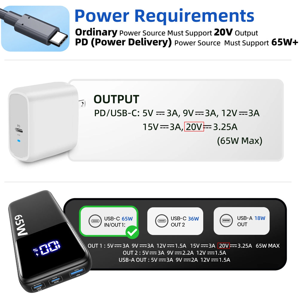 *【High Power Output】- To utilize its full potential, a PD power adapter or source capable of providing at least 65W (20V/3.25A) output is recommended. Always check the specifications of your power supply for compatibility.