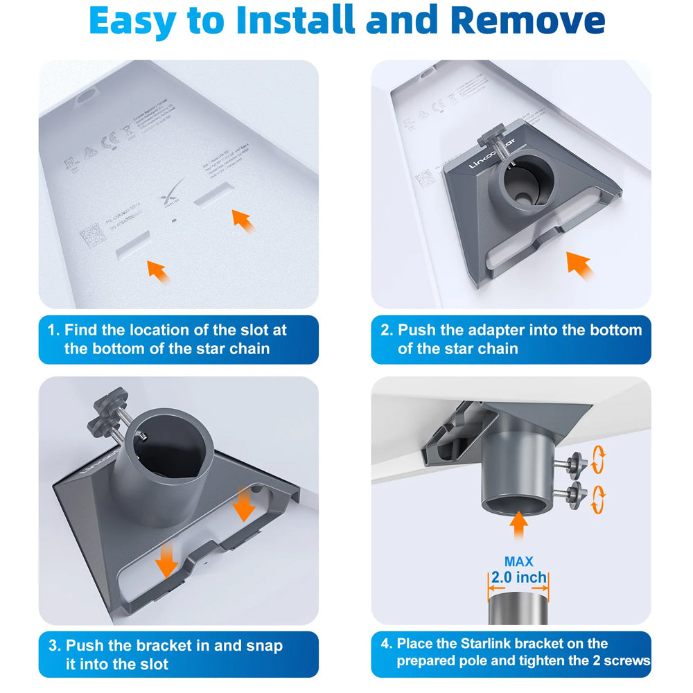 【Easy to Install】The starlink pole mount gen 3 is designed with user convenience in mind and has a simple installation process. In addition to the screws required for installation, Starlink Gen 3 Pole Mount Adapter set also comes with a wrench. (but poles not included) Simply insert Starlink Gen 3 Pipe Adapter into the pan slot and tighten the two set screws after adjusting suitable direction.