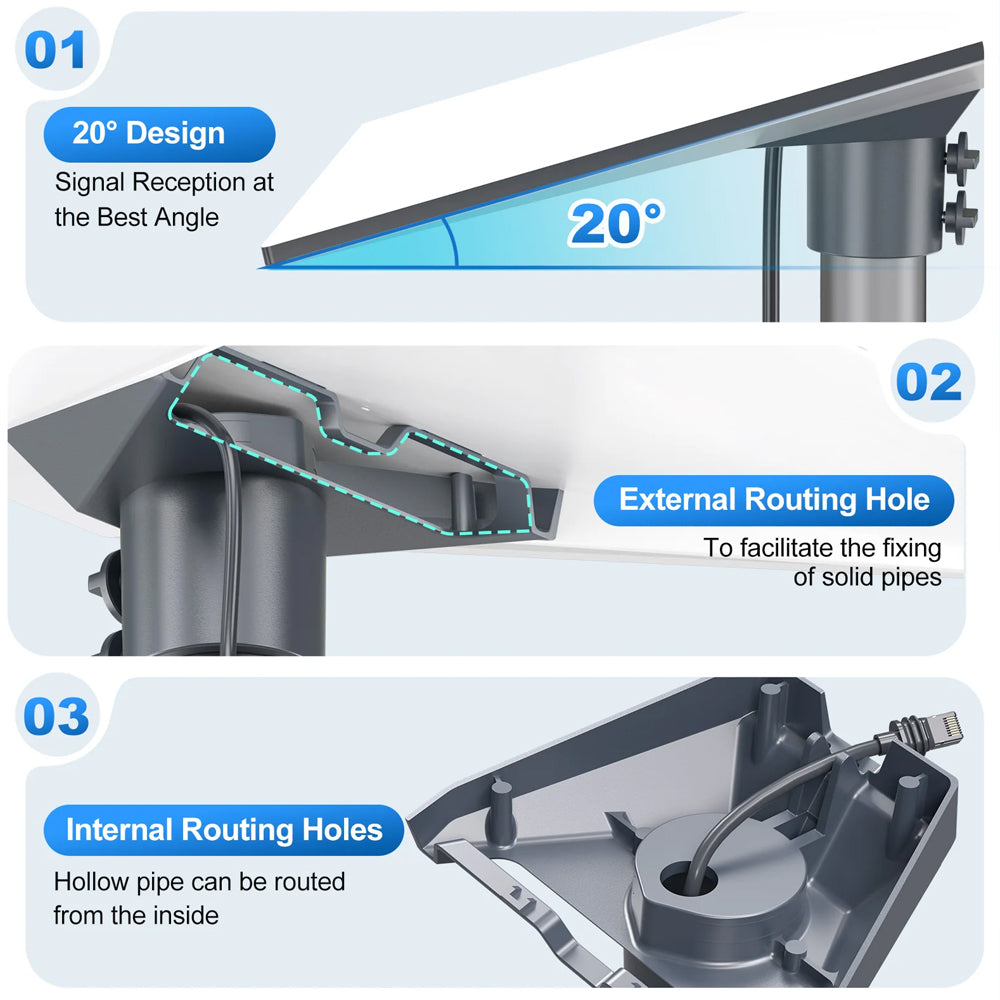 【Designed for Starlink Gen 3】The Starlink Gen 3 mounting is specially designed for Starlink Gen3/V4 dish antenna, which can be rotated 360° and tilted 20° , thus allowing the dish antenna to be correctly oriented on the pole to receive signals.