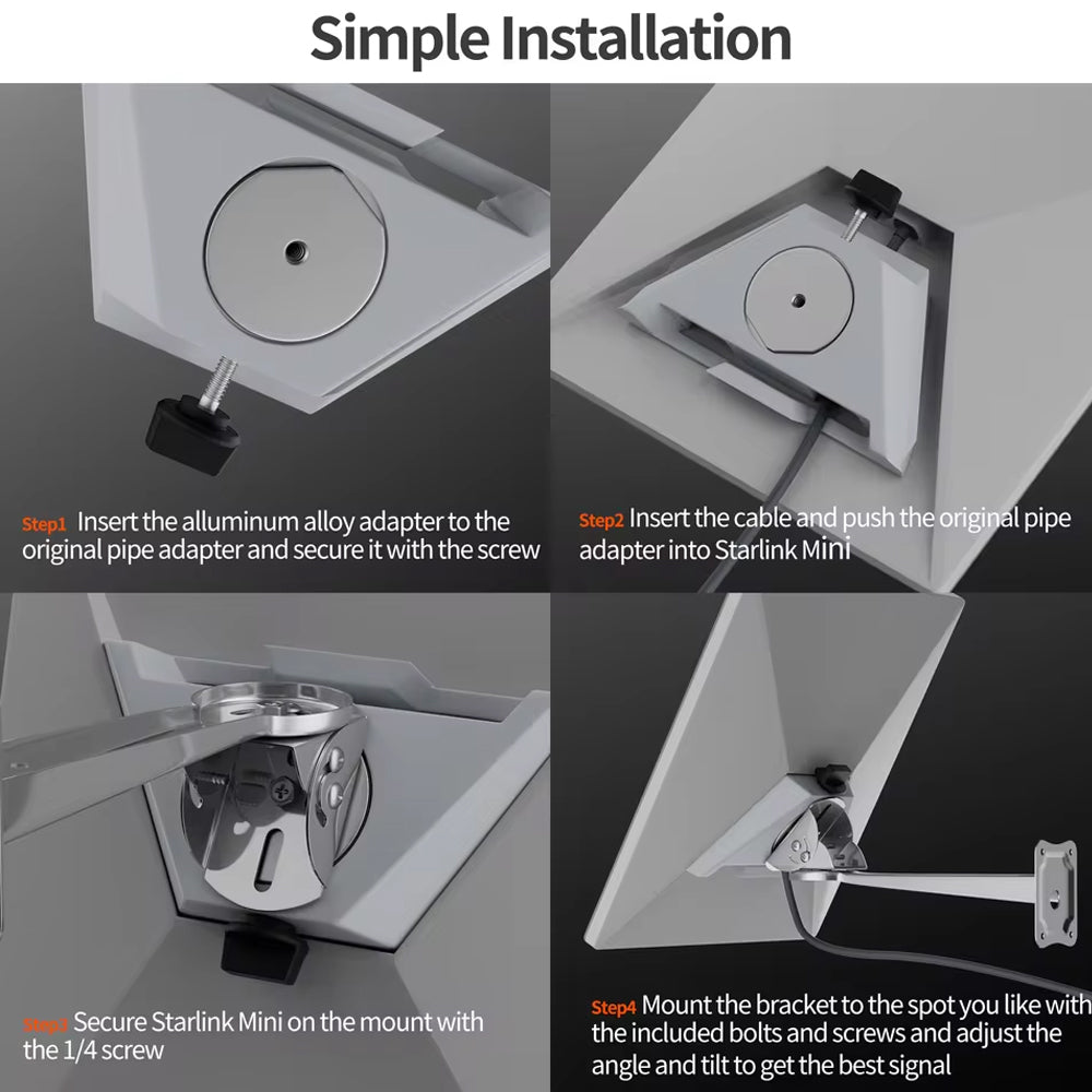 High Quality Material & Easy Installation: Made from high-quality alluminum alloy, the Starlink Mini Wall Mount holds your Starlink Mini dish antenna sturdy and it's extremely straightforward with installation.