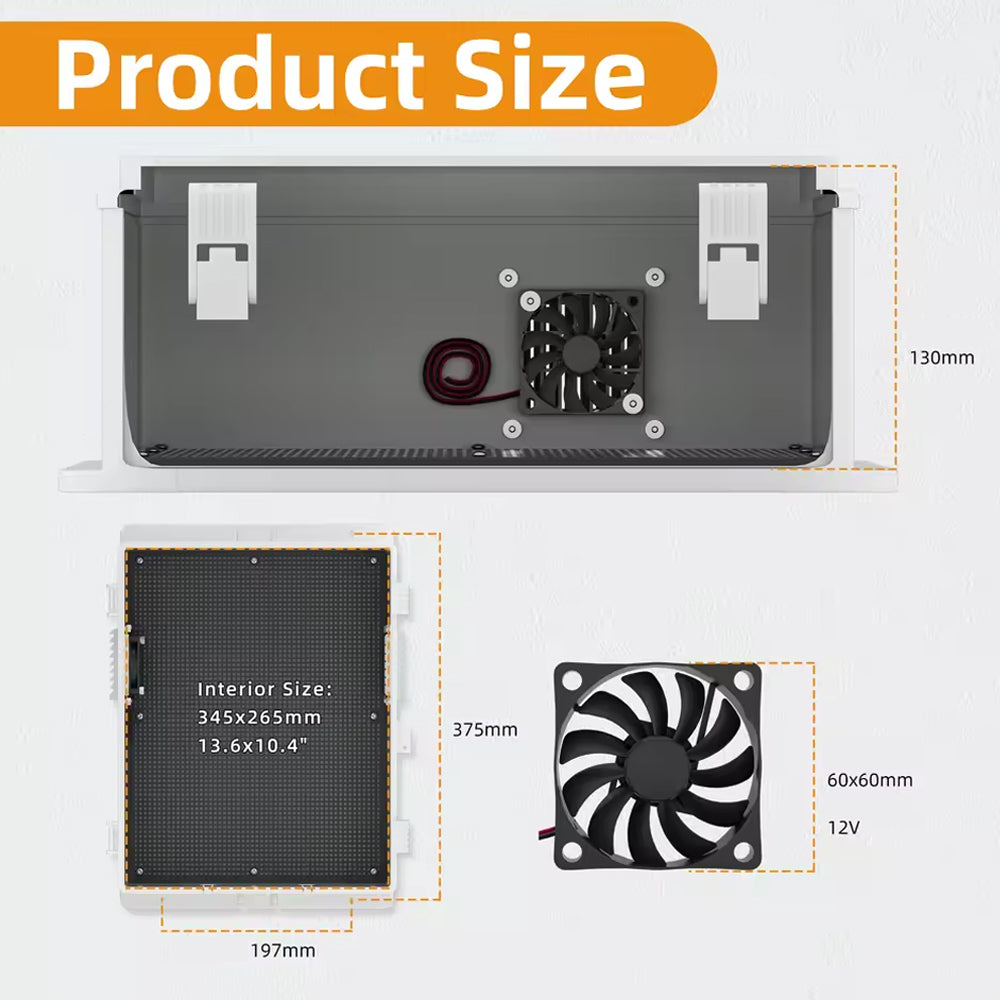 ◆【Ventilation and Heat Dissipation】 This outdoor electrical box is equipped with a 12v fan and 2 sufficiently large heat dissipation holes on both sides of the enclosure. The fan will start rapidly to remove heat from the enclosure when the temperature is too high, ensuring the normal operation of the devices.