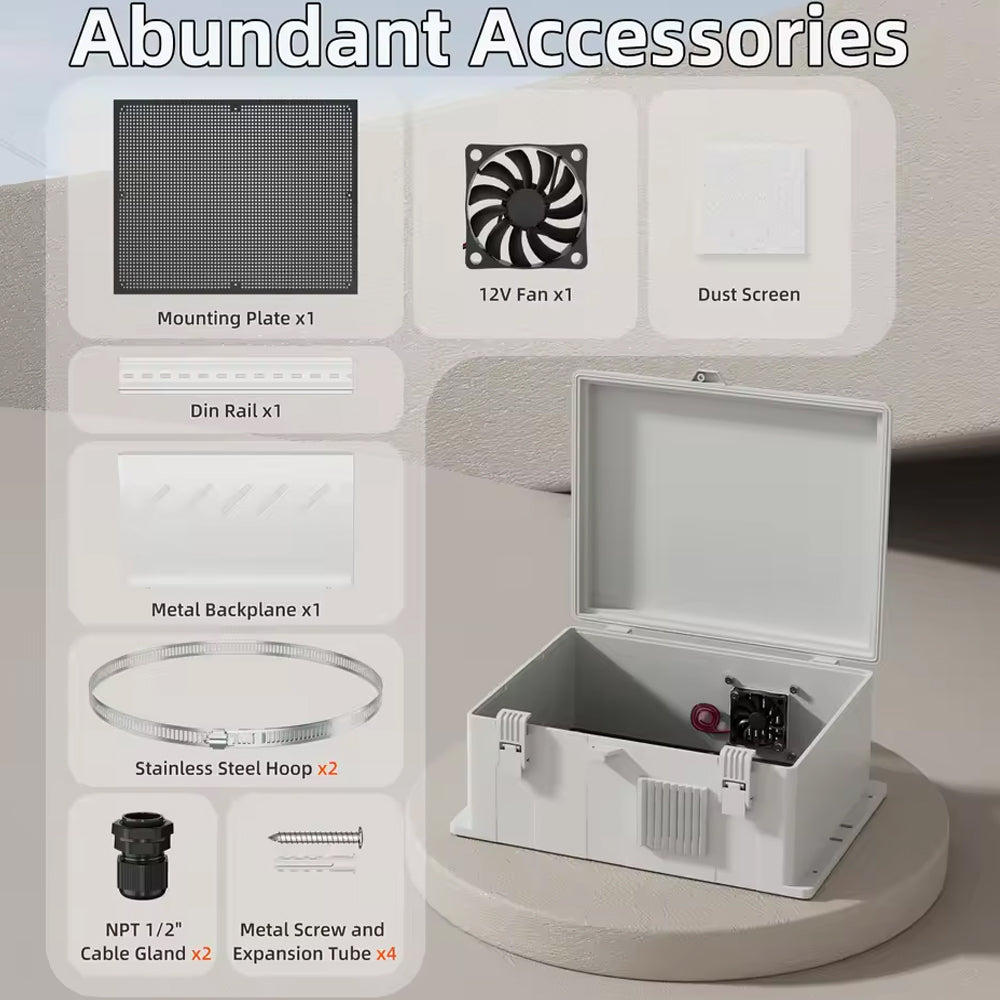 ◆【Abundant Accessories】 For this waterproof electrical box, we have prepared abundant accessories, including a DIN rail, a grid plate, a stainless backplane, 2 cable glands and some screws. Users can install their devices easily in the outdoor electrical box.
